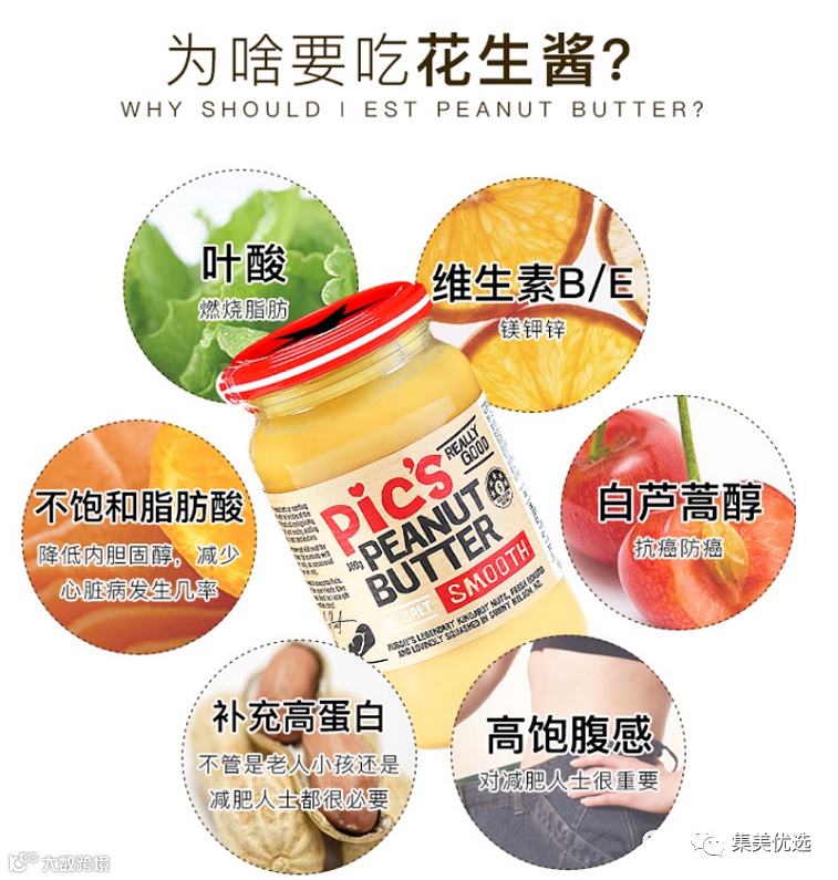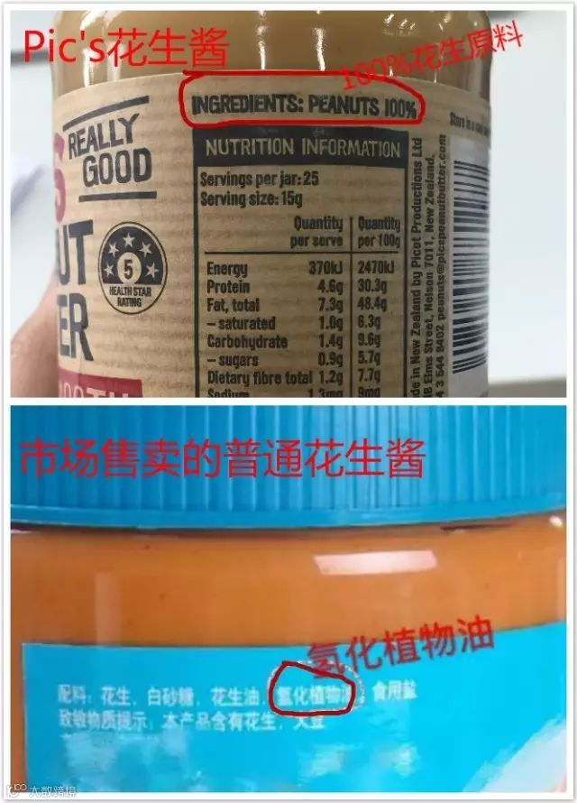 pics的花生酱是100%花生原料制成,无盐无添加剂无防腐剂。而市面上售卖的普通花生酱里面含有氢化植物油。氢化植物油,是一种保鲜剂和提味剂,常代替黄油和脂肪用于沙拉酱、人工黄油和烘烤食物等的加工。经常食用能导致肥胖,更严重的是导致高胆固醇和心脏病。