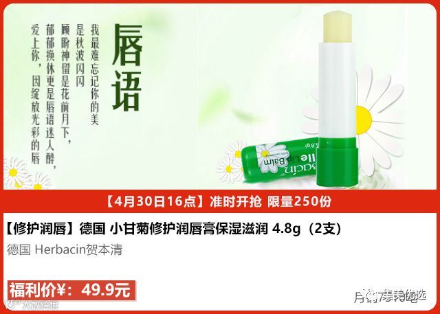 德国 Herbacin贺本清 小甘菊修护润唇膏保湿滋润 4.8g(2支)