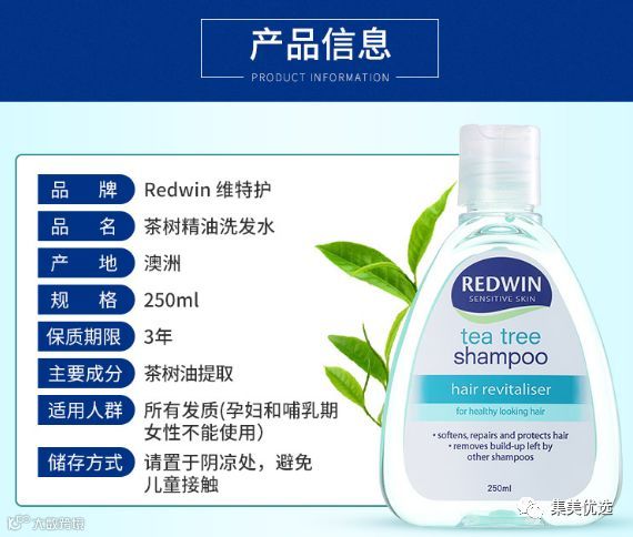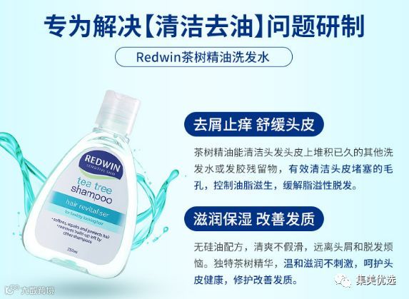 来自澳洲的Redwin茶树油洗发水专对头发清洁问题而设计,彻底清洁头发头皮上堆积已久的其他洗发水或发胶残留物,彻底杀菌,去油,清洁头皮堵塞的毛孔,从而可以预防和辅助治疗脂溢性脱发。