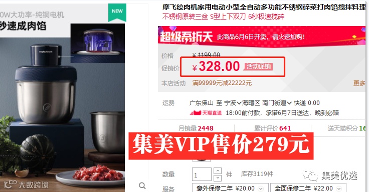 【年中大促】摩飞绞肉机家用电动小型多功能碎菜绞肉馅料理机不锈钢辅食搅拌机 原价:328元 VIP /黑卡M1会员 福利补贴价:279元(新疆西藏+10元运费)
