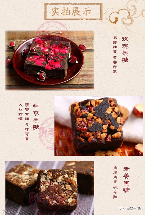 口味:大枣黑糖 、老姜黑糖、原味黑糖、玫瑰黑糖