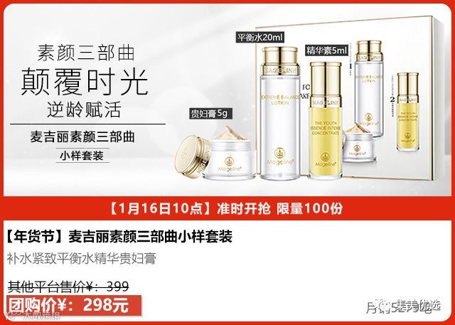 麦吉丽小样三部曲套盒,一个月的量!包括平衡水20ml+青春浓缩精华素5ml+贵妇美颜膏5g。麦吉丽素颜三部曲小样装,简单三步紧致嫩肤提亮,见证肌肤改变&赋予女性自信!