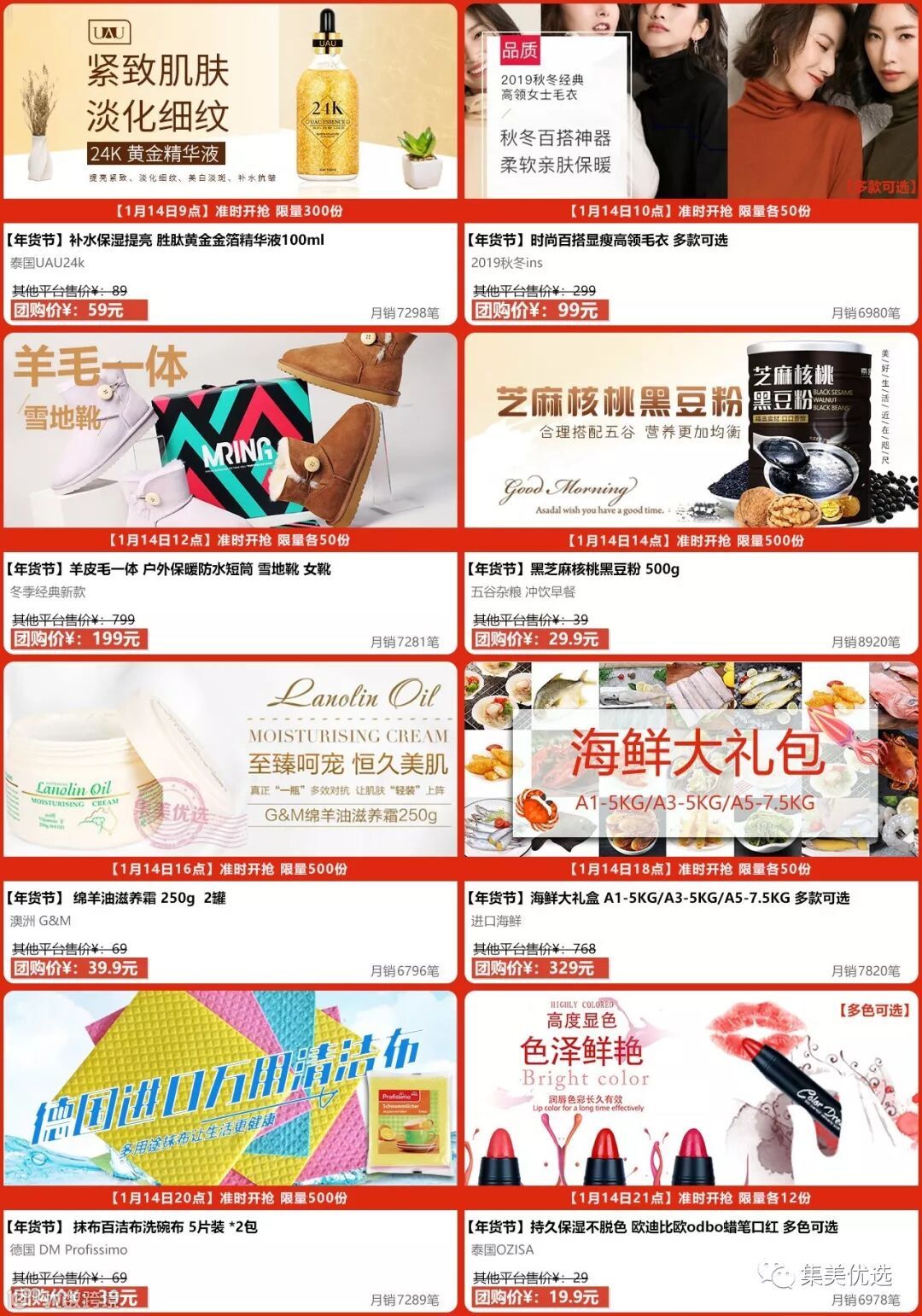 集美商城1月8日起年货节开幕,8档准时开抢!鲜果美酒,坚果化妆品,腊味日用品臻品油。置办年货来集美,千款好货秒杀价包邮到家!