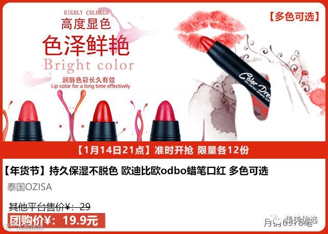非常火的泰国OZISA蜡笔口红,集口红+唇线笔+唇膏于一身。持久保湿不易脱色哑光雾面,显白,多色可选,黄皮白皮都可以驾驭!雾面的质感上唇非常有个性,上色非常饱满,虽是哑光质地但采用了摩洛哥坚果油配方,涂在嘴上非常保湿,滋润度分分钟俘获你的芳心!超级少女提气色!