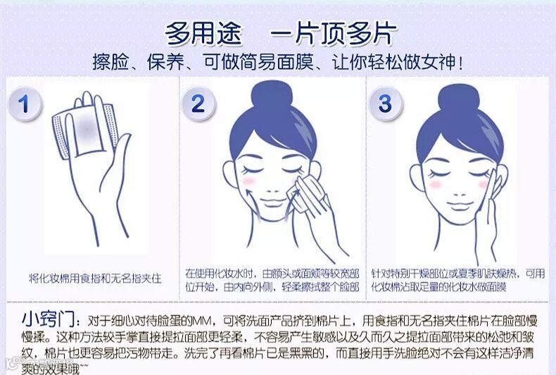 适用范围:全脸肌肤保养、拍拭化妆水、卸妆、卸指甲油、湿敷等