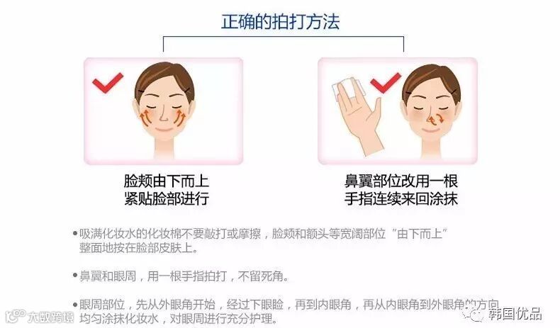蘸取适量的化妆水在化妆棉上,由两颊开始由外往内打圈涂抹,直至涂抹均匀,使化妆水在脸上得到很好的分散,第二遍可以蘸湿化妆棉后全脸轻轻按压拍打(敏感性肌肤避免此步骤),加强渗透吸收。对于鼻翼、眼角等容易积垢的死角部位,可以将化妆棉卷在食指上或折成三角形(利用顶角),再蘸湿卸妆产品轻轻擦拭,这样就可以把死角部位清理干净。