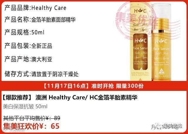 Healthy Care羊胎素金箔精华液,羊胎素是澳洲爆款产品!强烈推荐澳洲HC羊胎素美白保湿抗皱精华液 50ML,蕴含水溶性浓缩羊胎素、骨胶原蛋白、DHR RNA、维他命E、金箔、甘菊花。保湿抗氧化抗衰老,淡斑修复,美白滋养,按出来像果冻一样,涂在皮肤上马上变成水样质地,超轻薄好吸收!而且味道真的是太好闻了,十分滋养水润!