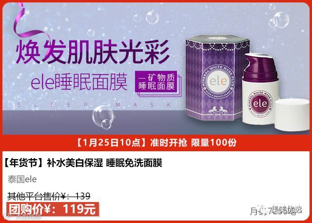 ele睡眠面膜,是泰国一款非常热门的睡眠免洗面膜,强烈推荐给喜欢熬夜的小仙女。乳白色,无味,质地不粘腻,很好推开,按摩两分钟就很清爽了,不会粘枕头和头发。具有滋养皮肤,收缩毛孔,紧致皮肤,保湿光滑,具有淡斑效果!
