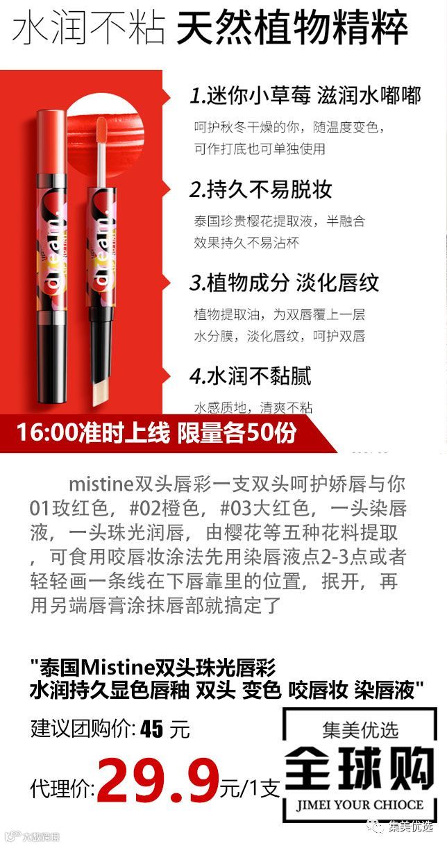 mistine双头唇彩一支双头呵护娇唇与你#01玫红色,#02橙色,#03大红色,一头染唇液,一头珠光润唇,由樱花等五种花料提取,可食用咬唇妆涂法先用染唇液点2-3点或者轻轻画一条线在下唇靠里的位置,抿开,再用另端唇膏涂抹唇部就搞定了