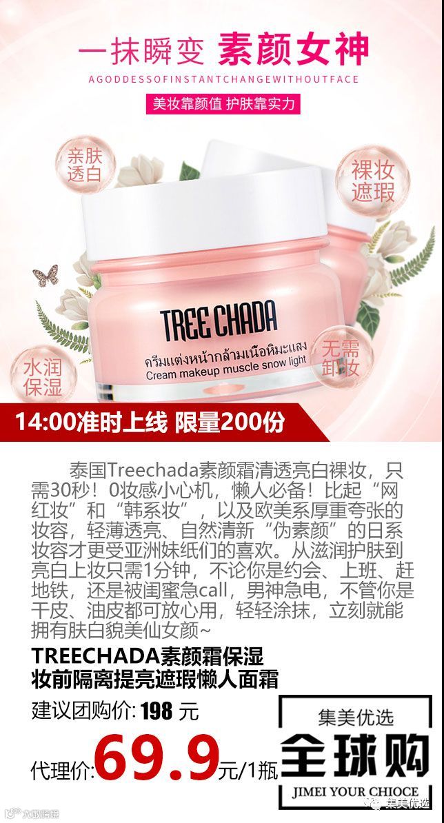 泰国Treechada素颜霜清透亮白裸妆,只需30秒!0妆感小心机,懒人必备!比起“网红妆”和“韩系妆”,以及欧美系厚重夸张的妆容,轻薄透亮、自然清新“伪素颜”的日系妆容才更受亚洲妹纸们的喜欢。从滋润护肤到亮白上妆只需1分钟,不论你是约会、上班、赶地铁,还是被闺蜜急call,男神急电,不管你是干皮、油皮都可放心用,轻轻涂抹,立刻就能拥有肤白貌美仙女颜~
