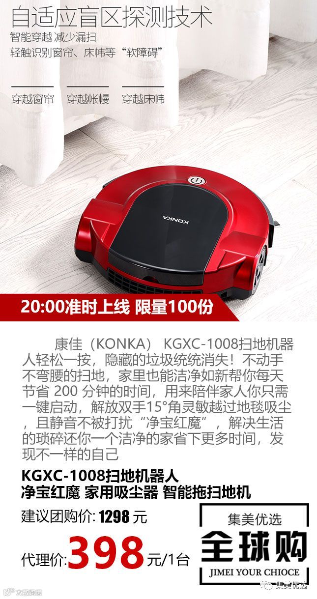康佳(KONKA) KGXC-1008扫地机器人轻松一按,隐藏的垃圾统统消失!不动手不弯腰的扫地,家里也能洁净如新帮你每天节省 200 分钟的时间,用来陪伴家人你只需一键启动,解放双手15°角灵敏越过地毯吸尘,且静音不被打扰“净宝红魔”,解决生活的琐碎还你一个洁净的家省下更多时间,发现不一样的自己
