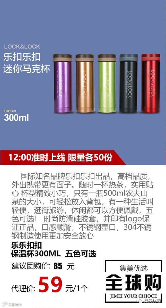 国际知名品牌乐扣乐扣出品,高档品质,外出携带更有面子。随时一杯热茶,实用贴心 杯型精致小巧,只有一瓶500ml农夫山泉的大小,可轻松放入背包,有一种生活叫轻便,逛街旅游,休闲都可以方便佩戴,五色可选! 时尚防滑硅胶套,并印有logo保证正品,口感顺滑,不锈钢壶口,304不锈钢制造使用更加安全放心