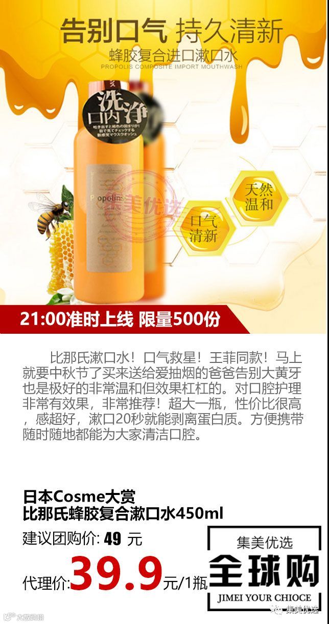 日本Cosme大赏比那氏蜂胶复合漱口水450ml