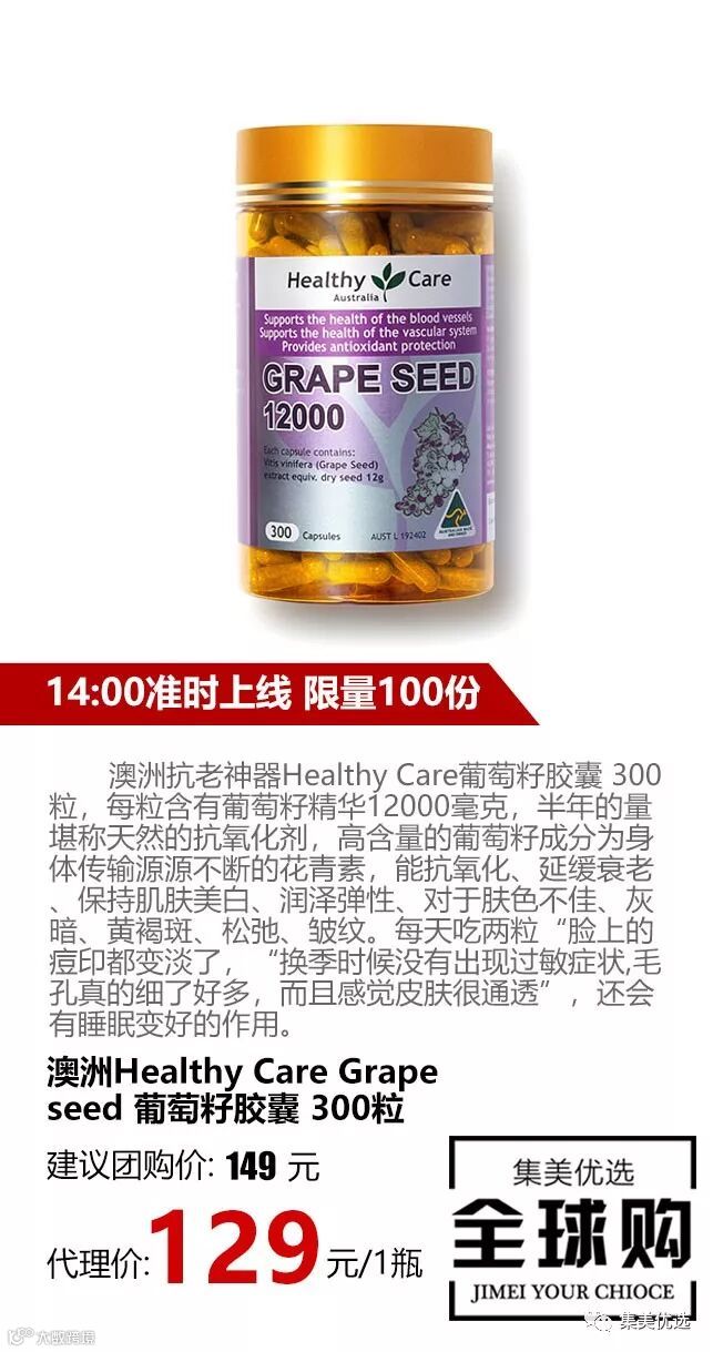 澳洲抗老神器Healthy Care葡萄籽胶囊 300粒,每粒含有葡萄籽精华12000毫克,半年的量堪称天然的抗氧化剂,高含量的葡萄籽成分为身体传输源源不断的花青素,能抗氧化、延缓衰老、保持肌肤美白、润泽弹性、对于肤色不佳、灰暗、黄褐斑、松弛、皱纹。每天吃两粒“脸上的痘印都变淡了,“换季时候没有出现过敏症状”“毛孔真的细了好多,而且感觉皮肤很通透”,还会有睡眠变好的作用~