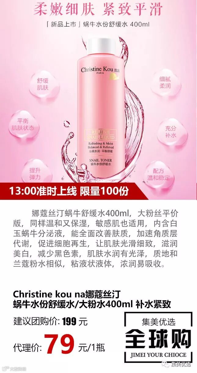 娜蔻丝汀蜗牛舒缓水400ml,大粉丝平价版,同样温和又保湿,敏感肌也适用,内含白玉蜗牛分泌液,能全面改善肤质,加速角质层代谢,促进细胞再生,让肌肤光滑细致,滋润美白,减少黑色素,肌肤水润有光泽,质地和兰蔻粉水相似,粘液状液体,浓润易吸收~