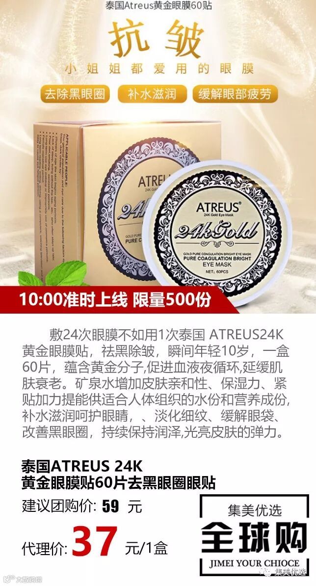 敷24次眼膜不如用1次泰国 ATREUS24K黄金眼膜贴,祛黑除皱,瞬间年轻10岁,一盒60片,蕴含黄金分子,促进血液夜循环,延缓肌肤衰老。矿泉水增加皮肤亲和性、保湿力、紧贴加力提能供适合人体组织的水份和营养成份,补水滋润呵护眼睛、淡化细纹、缓解眼袋、改善黑眼圈,持续保持润泽,光亮皮肤的弹力~
