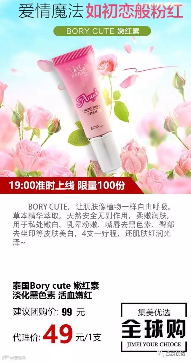 BORY CUTE,让肌肤像植物一样自由呼吸。草本精华萃取,天然安全无副作用,柔嫩润肤,用于私处嫩白、乳晕粉嫩、嘴唇去黑色素、臀部去坐印等皮肤美白,4支一疗程,还肌肤红润光泽~