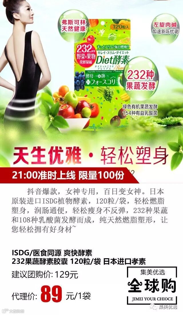 抖音爆款,女神专用,百日变女神。日本原装进口ISDG植物酵素,120粒/袋,轻松燃脂塑身,润肠通便,轻松瘦身不反弹,232种果蔬和108种乳酸菌发酵而成,纯天然燃脂塑形,让您轻松拥有好身材~