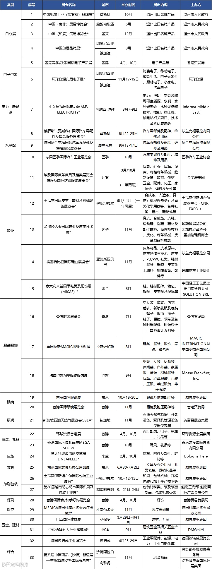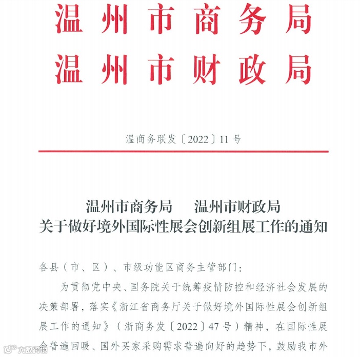 为贯彻党中央、国务院关于统筹疫情防控和经济社会发展的决策部署,落实《浙江省商务厅关于做好境外国际性展会创新组展工作的通知》(浙商务发〔2022〕47号)精神,抢抓国际性展会普遍回暖、国外买家采购需求普遍向好的趋势机遇,温州市商务局、温州市财政局联合印发《关于做好境外国际性展会创新组展工作的通知》,鼓励我市外贸企业借助“代参展”新模式应展尽展、全力出展抢订单,力保外贸基本盘。