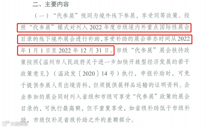 1.“代参展”视同为境外线下参展,享受同等政策。按照“代参展”模式对列入2022年度市级境内外重点国际性展会目录的线下境外展会进行补助,享受补助的展会举办时间从2022年1月1日至2022年12月31日。市级“代参展”展会扶持政策按照《温州市人民政府关于进一步加快开放型经济发展的若干政策意见》(温政发〔2020〕14号)执行,申报补助时,可免于提供参展人员出境资料,但须提供展样品运输的证明资料。企业参加的展会同时列入省级和市级可享受“代参展”政策的展会目录的,可执行最高额,但不重复享受,如省级补助低于市级补助,市级仅补足省级补助之外的差额部分。