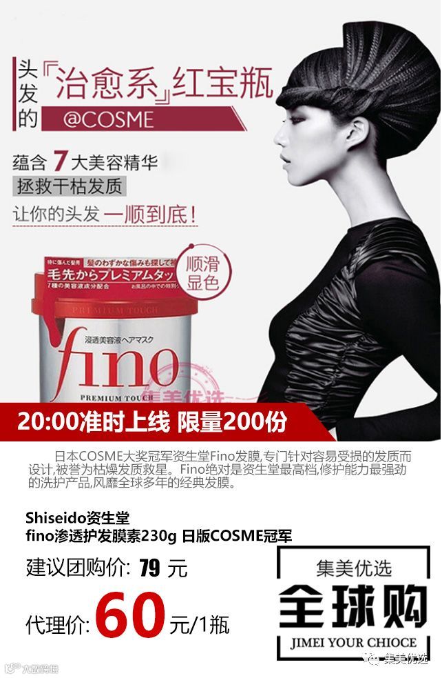 日本Shiseido资生堂 Fino渗透护发膜230g 柔顺保湿 日版。洗完头发后抹一点,可以当护发素也可以当发膜 洗完后淡淡的香味,头发变的很柔顺 大力推荐,富含维生素E的小麦胚芽精华加上3倍之多的护发美容液精华,具有抗氧化效果,调理头发表层的毛鳞片、使头发变得滋润、顺滑。使用后,即可感到头发充满弹性,更加柔顺于飘逸,头发不再产生空洞,不易折断、脱落。