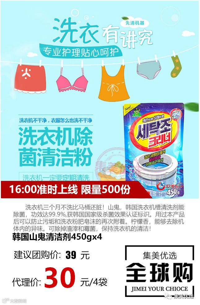 平常经常用洗衣机洗衣服,不管衣服多脏都扔下去洗,可想而知洗衣机是有多脏啊。韩国山鬼安全洗衣机槽清洁剂450g,除菌去垢,功效达99.9%,获韩国国家级杀菌效果认证标识,用过之后可以防止污垢和洗衣粉肥皂沫的再次附着,淡淡的柠檬香,去除机内异味,还您安全舒适的着装;