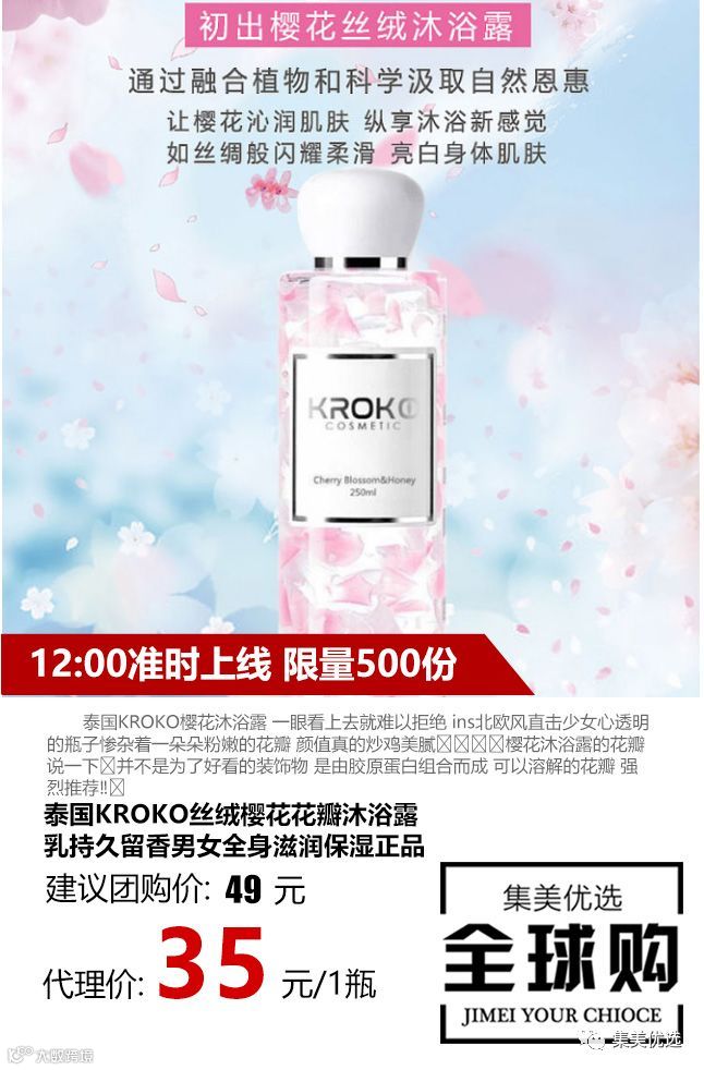 泰国进口KROKO樱花花瓣丝绒沐浴露,泰国的这款樱花kroko 🌸沐浴露颜值太高了,里面的花瓣更为真实饱满,🌸是由胶原蛋白组合而成🌸可以溶解的花瓣🌸倒在手上揉搓,樱花花瓣会自动融化,泡沫丰富,味道很清新好闻,不像一般沐浴露很大香精味,泡沫比较丰富细腻,洗完不干涩,也不会油腻,强烈推荐不单单是因为颜值🌸皮肤的反馈才是最重要的👍🏻不假滑,真正清洁滋润美白为一体💧人手两瓶都不为。