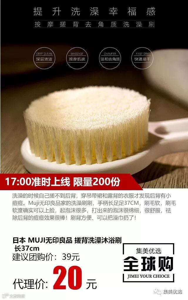 洗澡的时候自己搓不到后背,穿吊带裙和露背的衣服才发现后背有小痘痘。Muji无印良品家的洗澡刷刷,手柄长足足37CM,刷毛软,刷毛软度确实可以上脸,起泡沫很多,打出来的泡沫很绵细,很舒服,祛除后背的痘痘效果很棒!刷背方便、可以把澡巾扔了!