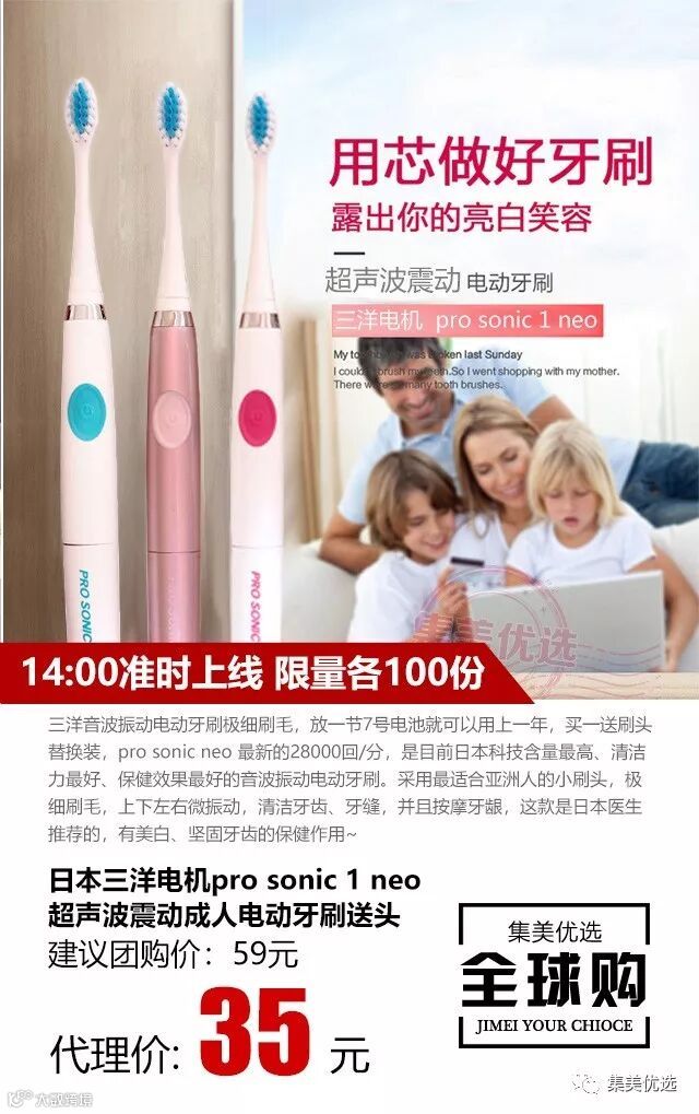 三洋音波振动电动牙刷️极细刷毛,放一节7号电池就可以用上一年,买一送刷头替换装,pro sonic neo 最新的28000回/分,是目前日本科技含量最高、清洁力最好、保健效果最好的音波振动电动牙刷。采用最适合亚洲人的小刷头,极细刷毛,上下左右微振动,清洁牙齿、牙缝,并且按摩牙龈,这款是日本医生推荐的,有美白、坚固牙齿的保健作用~