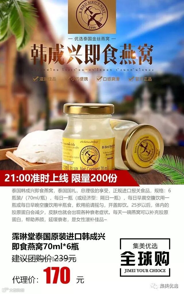 泰国韩成兴即食燕窝,泰国国礼,总理级的享受,正规进口报关食品,规格:6瓶装/(70ml/瓶),每日一瓶(或经济型:隔日一瓶),每日早晨空腹饮用一瓶或每日早晚空腹饮用半瓶食,飲用前请摇匀,开盖即饮。25岁以后,体内的胶原蛋白会减少,皮肤也就会出现各种衰老症状。每天一碗燕窝可以补充胶原蛋白,帮助养颜,延缓衰老,是女性滋补佳品~