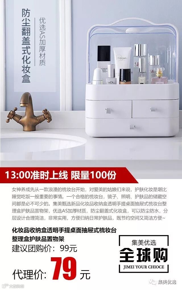 女神养成先从一款浪漫的梳妆台开始,对爱美的姑娘们来说,护肤化妆是堪比睡觉吃饭一般重要的事情。一个合格的梳妆台,镜子、照明、护肤品的储藏空间都是必不可少的。集美甄选新品化妆品收纳盒透明手提桌面抽屉式梳妆台整理盒护肤品置物架,优选AS加厚材质,防尘翻盖式化妆盒,可以防尘防水,分层设计合理简洁,非常实用,方便归纳日常护肤品,既节约空间又简洁方便~
