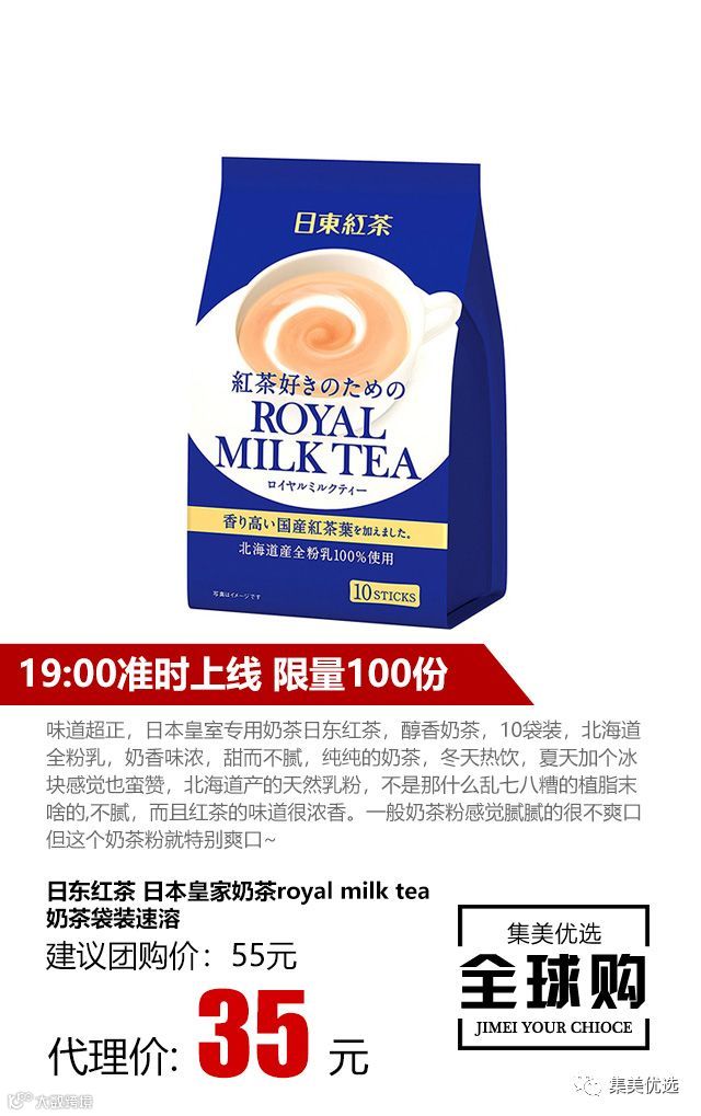 味道超正,日本皇室专用奶茶日东红茶,醇香奶茶,10袋装,北海道全粉乳,奶香味浓,甜而不腻,纯纯的奶茶,冬天热饮,夏天加个冰块感觉也蛮赞,北海道产的天然乳粉,不是那什么乱七八糟的植脂末啥的,不腻,而且红茶的味道很浓香。一般奶茶粉感觉腻腻的很不爽口但这个奶茶粉就特别爽口~