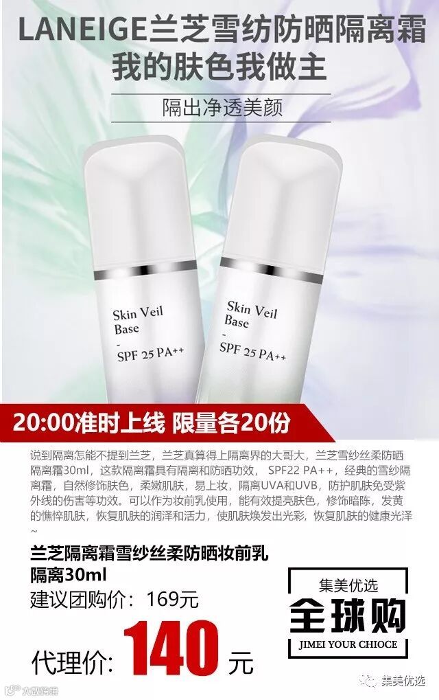 说到隔离怎能不提到兰芝,兰芝真算得上隔离界的大哥大,兰芝雪纱丝柔防晒隔离霜30ml,这款隔离霜具有隔离和防晒功效, SPF22 PA++,经典的雪纱隔离霜,自然修饰肤色,柔嫩肌肤,易上妆,隔离UVA和UVB,防护肌肤免受紫外线的伤害等功效。可以作为妆前乳使用,能有效提亮肤色,修饰暗陈,发黄的憔悴肌肤,恢复肌肤的润泽和活力,使肌肤焕发出光彩, 恢复肌肤的健康光泽~