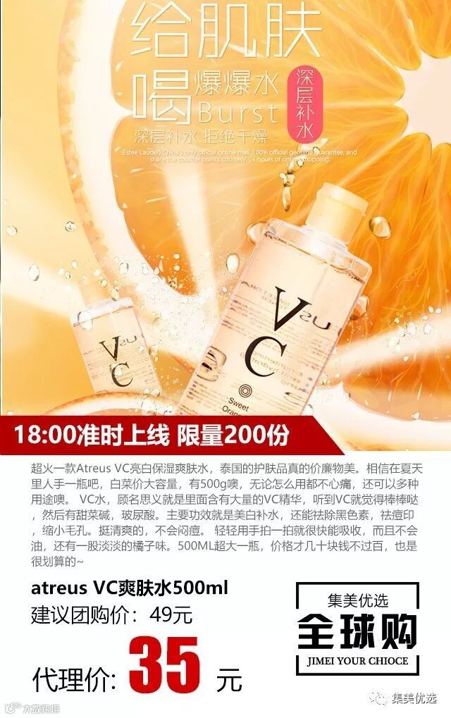 超火一款Atreus VC亮白保湿爽肤水,泰国的护肤品真的价廉物美。相信在夏天里人手一瓶吧,白菜价大容量,有500g噢,无论怎么用都不心痛,还可以多种用途噢。 VC水,顾名思义就是里面含有大量的VC精华,听到VC就觉得棒棒哒,然后有甜菜碱,玻尿酸。主要功效就是美白补水,还能祛除黑色素,祛痘印,缩小毛孔。挺清爽的,不会闷痘。 轻轻用手拍一拍就很快能吸收,而且不会油,还有一股淡淡的橘子味。500ML超大一瓶,价格才几十块钱不过百,也是很划算的~