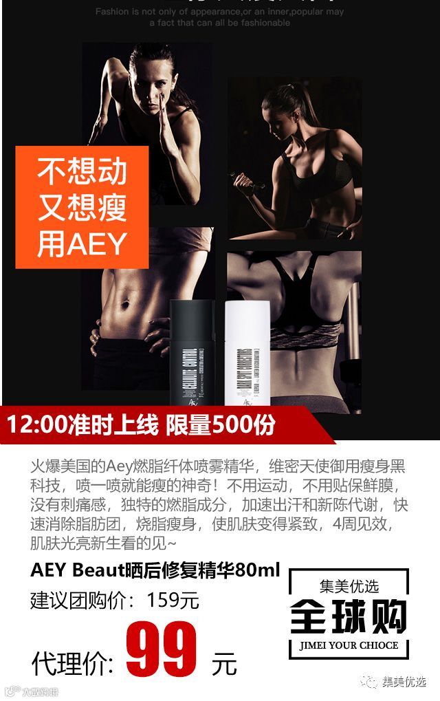 火爆美国的Aey燃脂纤体喷雾精华,维密天使御用瘦身黑科技,喷一喷就能瘦的神奇!不用运动,不用贴保鲜膜,没有刺痛感,独特的燃脂成分,加速出汗和新陈代谢,快速消除脂肪团,烧脂瘦身,使肌肤变得紧致,4周见效,肌肤光亮新生看的见~