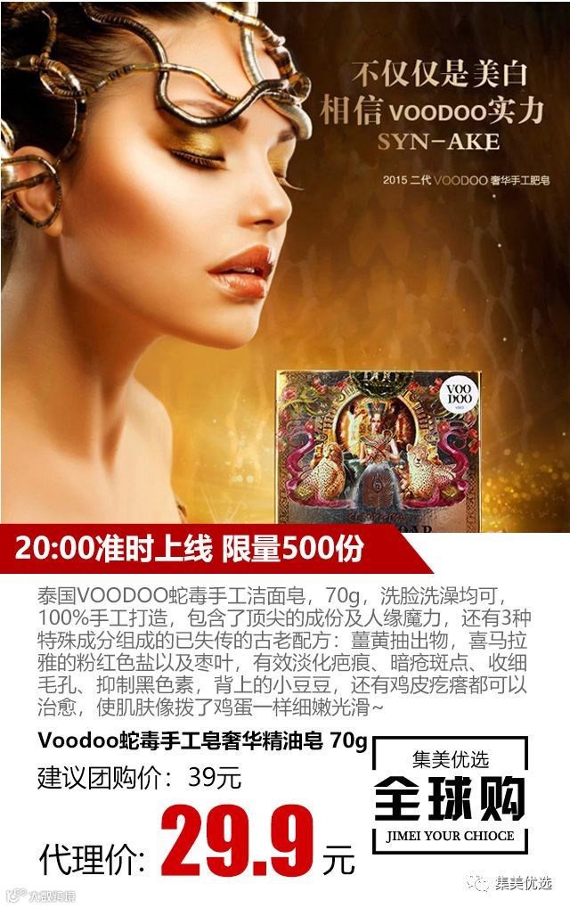 泰国VOODOO蛇毒手工洁面皂,70g,洗脸洗澡均可,100%手工打造,包含了顶尖的成份及人缘魔力,还有3种特殊成分组成的已失传的古老配方:薑黄抽出物,喜马拉雅的粉红色盐以及枣叶,有效淡化疤痕、暗疮斑点、收细毛孔、抑制黑色素,背上的小豆豆,还有鸡皮疙瘩都可以治愈,使肌肤像拨了鸡蛋一样细嫩光滑~