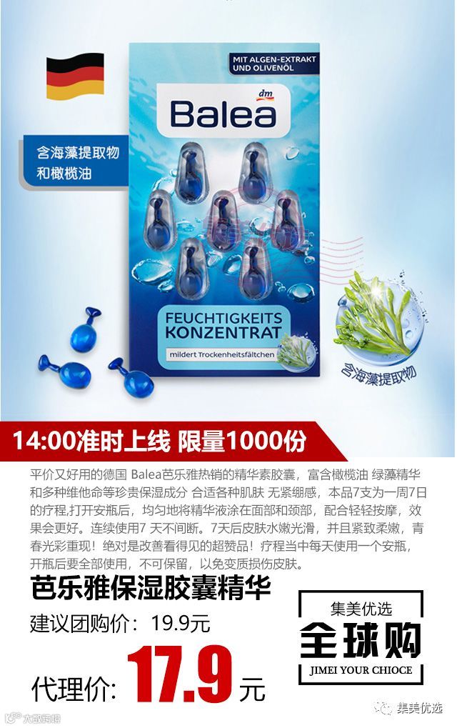 平价又好用的德国🇩🇪 Balea芭乐雅热销的精华素胶囊,富含橄榄油 绿藻精华和多种维他命等珍贵保湿成分 合适各种肌肤 无紧绷感,本品7支为一周7日的疗程,打开安瓶后,均匀地将精华液涂在面部和颈部,配合轻轻按摩,效果会更好。连续使用7 天不间断。7天后皮肤水嫩光滑,并且紧致柔嫩,青春光彩重现!绝对是改善看得见的超赞品!疗程当中每天使用一个安瓶,开瓶后要全部使用,不可保留,以免变质损伤皮肤。