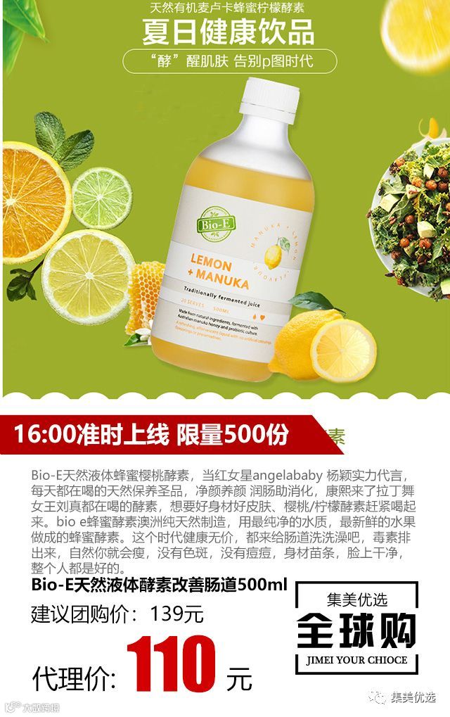 Bio-E天然液体蜂蜜樱桃酵素,当红女星angelababy 杨颖实力代言,每天都在喝的天然保养圣品,净颜养颜 润肠助消化,康熙来了拉丁舞女王刘真都在喝的酵素,想要好身材好皮肤、樱桃/柠檬酵素赶紧喝起来。bio e蜂蜜酵素澳洲纯天然制造,用最纯净的水质,最新鲜的水果做成的蜂蜜酵素。这个时代健康无价,都来给肠道洗洗澡吧,毒素排出来,自然你就会瘦,没有色斑,没有痘痘,身材苗条,脸上干净,整个人都是好的。