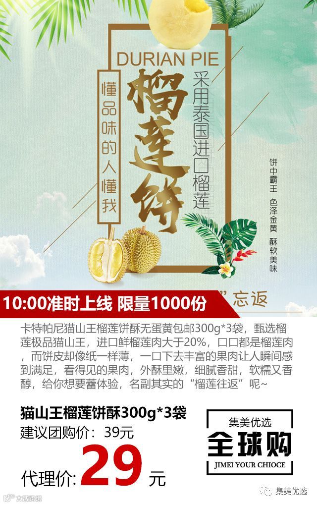 卡特帕尼猫山王榴莲饼酥无蛋黄包邮300g*3袋,甄选榴莲极品猫山王,进口鲜榴莲肉大于20%,口口都是榴莲肉,而饼皮却像纸一样薄,一口下去丰富的果肉让人瞬间感到满足,看得见的果肉,外酥里嫩,细腻香甜,软糯又香醇,给你想要蕾体验,名副其实的“榴莲往返”呢~