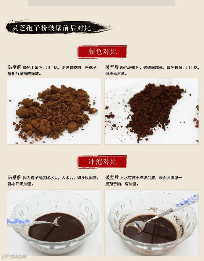 灵芝孢子粉有区分于灵芝整体打粉,也就是我们常言的“假粉”: