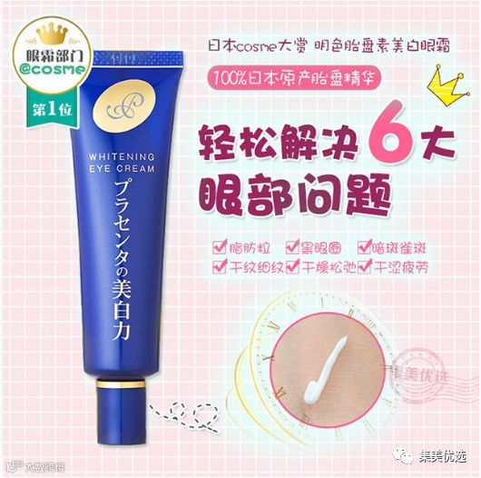 日本Cosme大赏眼霜类排行第一位的眼霜, 明色在日本也是百年企业哦,品质有保障!胎盘素精华,具有提亮眼周、淡化色斑的作用。富含胶原蛋白,可以让眼周肌肤变得弹力紧致;再加上薏米的保湿成分,能在紧致肌肤的同时长效保湿,缓解眼部的干纹和细纹,对于黑眼圈有很好的改善作用,长期使用会让眼部肌肤变得明亮水润。