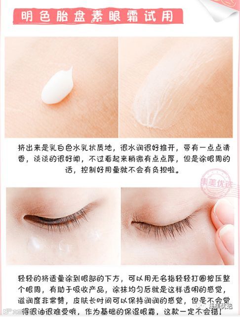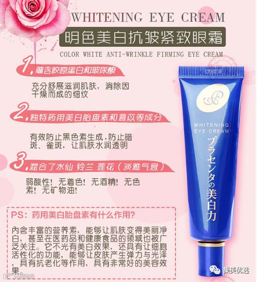 明色胎盘精华美白抗皱眼霜这个系列是它家的高机能护理系列,内含丰富的营养素,比如胶原蛋白,药用美白TAU=I盘素,薏苡等成分,达到美白抗衰老的效果,让肌肤变得更净白。而且明色胎盘精华美白抗皱眼霜是拿过COSME大奖的,主要是能消除因干燥而成的细纹,胎盘美白效力有效防止黑色素生成,防止暗斑、雀斑,让肌肤水润透明。