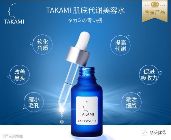 TAKAMI肌底液能隐形毛孔,改善皮肤状况。能软化角质层,加快代谢,改善黑头,防止皮肤干燥,收缩毛孔,是闭口的克星。具有整肌效果,有效改善反复发痘的不健康肌肤。