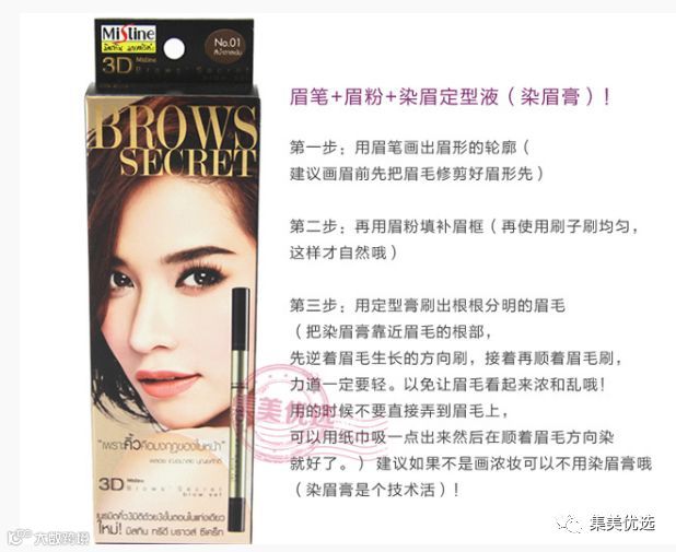 国Mistine3D眉笔眉粉染眉膏,三合一套装立体一字眉自动防水防汗,大牌的手笔,3D眉笔+染眉定型+眉粉!有很多宝宝不画眉就不出门!眉笔眉粉染眉膏一个都不少!用3D眉笔,自然立体,十分持久!不易晕染,防水防汗,眉妆持久。第一步用眉笔画出轮廓;第二步用眉粉染出眉色;第三部用定型膏刷出根根分明的眉毛,精致的眉就搞定啦。