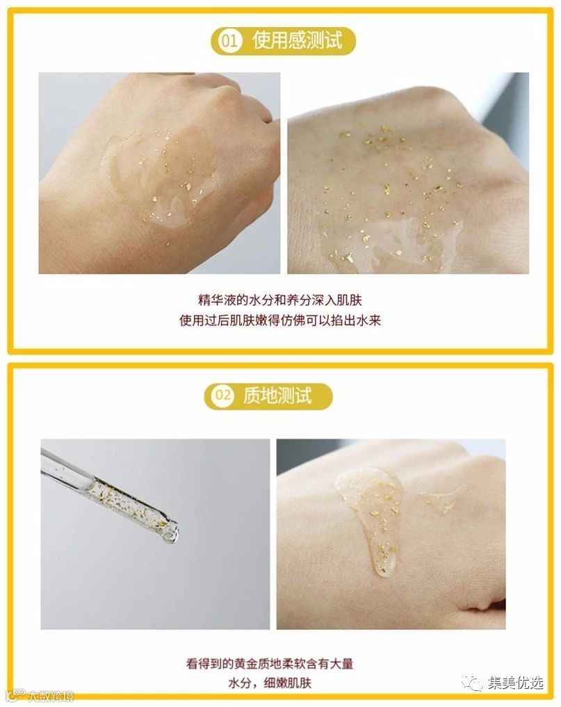 用完化妆水,就用它,因为是浓缩精华,吸收力,渗透力很强。打圈按摩,直到金箔完全吸收就可以。没有一丢丢油腻,黏糊的赶脚,金箔完全吸收以后,你就会感觉特别细腻,嫩嫩的,超有弹性。自己也可以涂半张脸做一下对比一下试试。超级明显的。