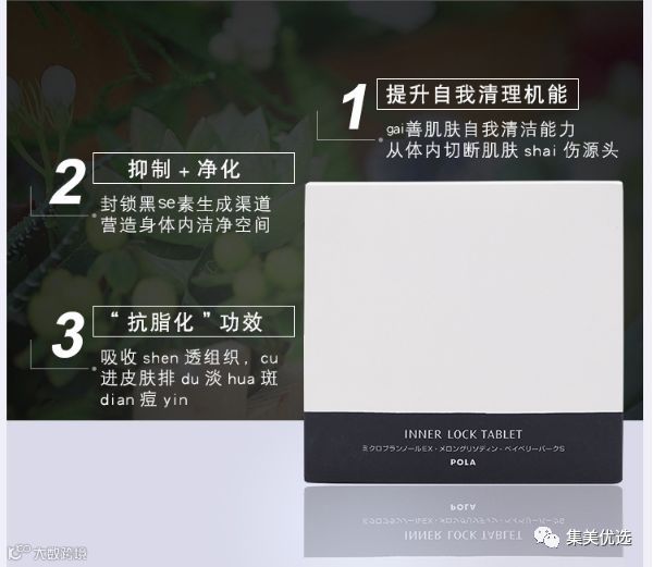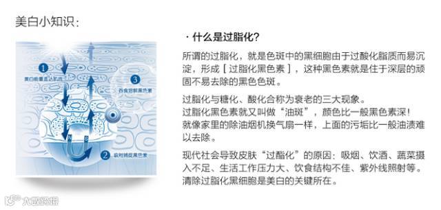 POLA美白丸提取的都是植物精华,实际就是主打精华美白成分,他提出了一个独特的概念叫过脂化。“过脂化”是指体内的氧化脂质如果累积就会产生黑色素和斑点,即使使用美白精华,却也是没有办法对抗体内产生黑色素的源头,只能治标不治本,而POLA美白丸可以抑制体内黑色素的源头,阻止黑色素的形成,这样自然就能白白白下去啦。