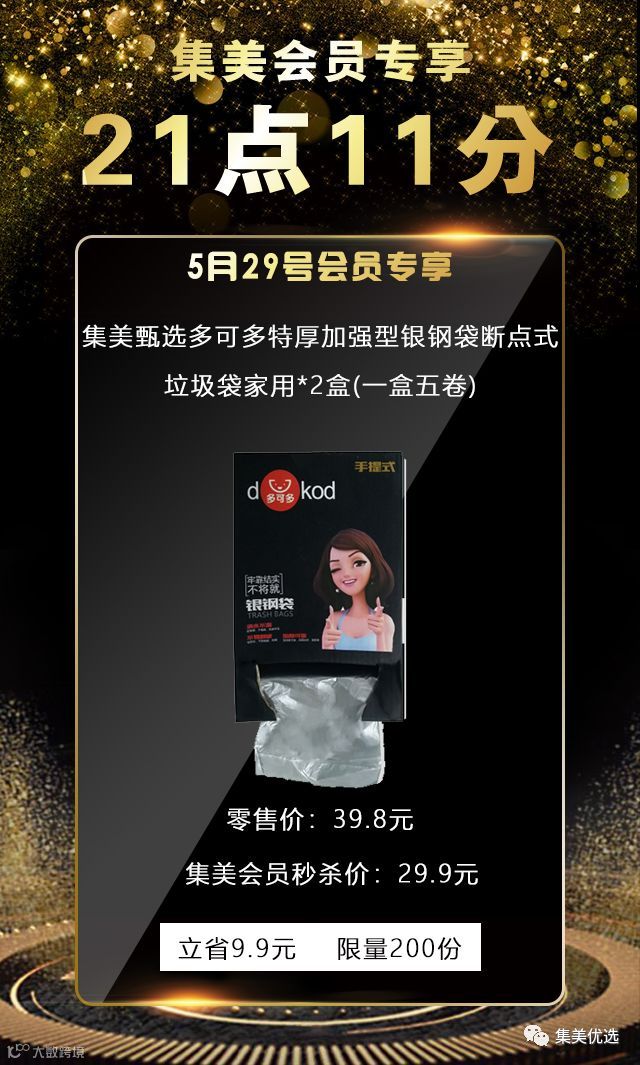 5月29日,21:11,集美甄选多可多特厚加强型银钢袋断点式垃圾袋家用 2盒,原价39.8元,建议零售价29.9元,限量500份,手慢无!!!