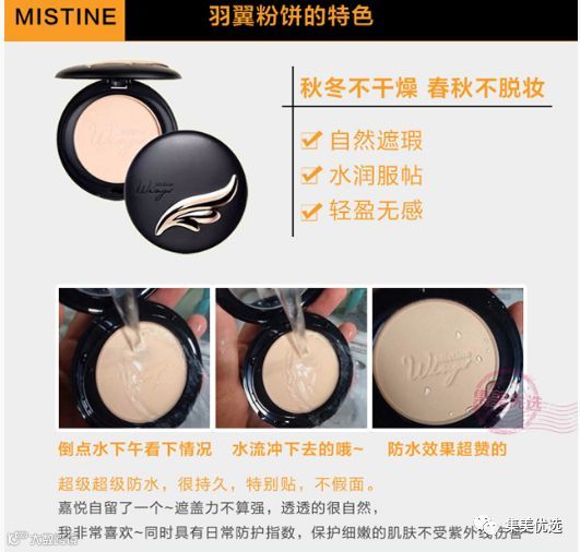 Mistine的镇店之宝!曾经代表过Mistine公司在法国🇫🇷拿过奖。法国可是个化妆品大国,可想而知,这款羽翼粉饼是多优秀👍。Mistine羽翼粉饼得奖的原因就是:超细腻的粉质,比普通的粉饼还要细上很多倍。所以不仅遮瑕效果好,控油效果也是肉眼可见,不管你有多油腻,扑上去迅速变哑光🌝。妆效真的很高级👸,就像自己的皮肤一样,没有一点厚重的粉质感。