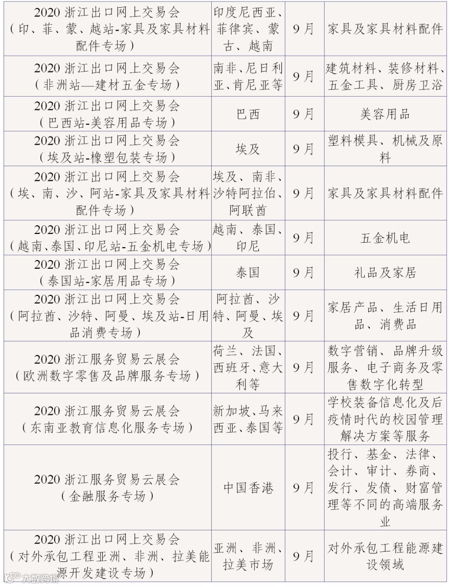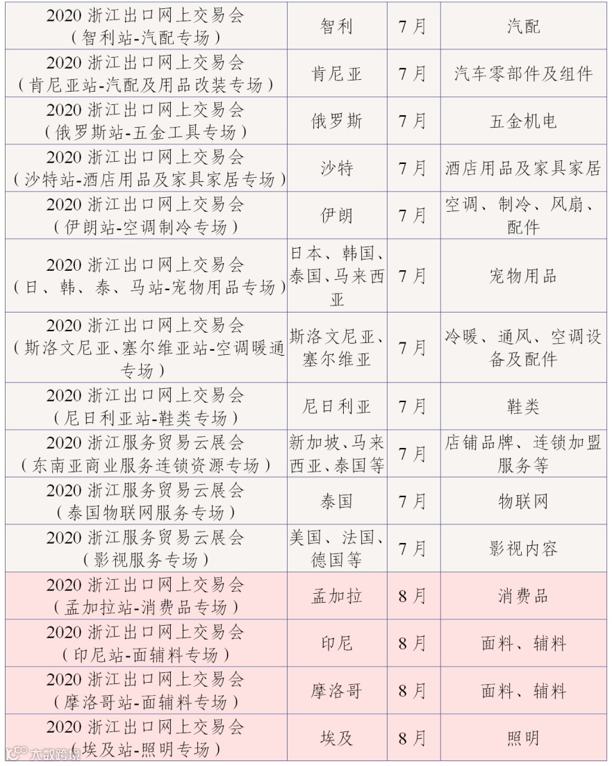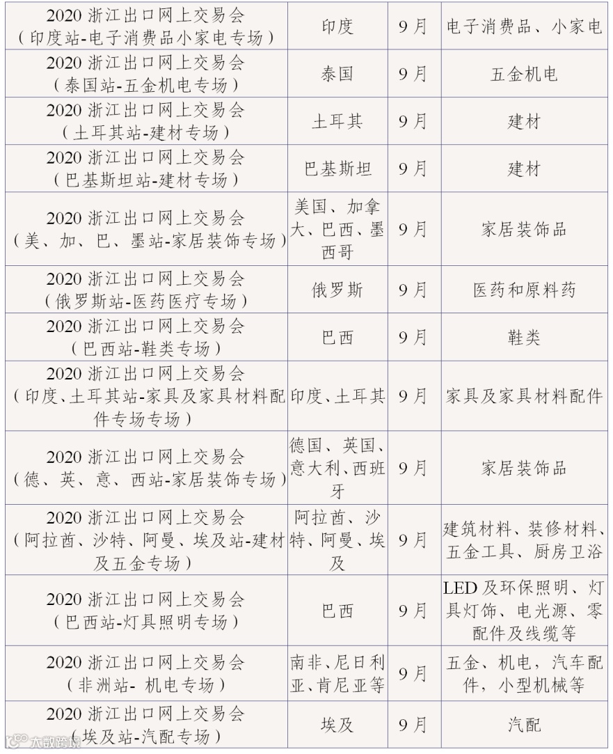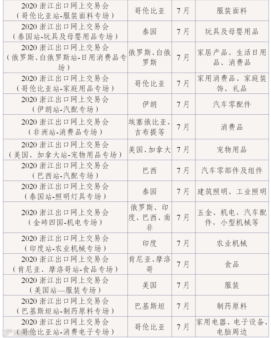 为丰富网上交易会内容,7-9月的网上交易会将根据展会的特点开展“云论坛”“云展示”“云洽谈”“云签约”等形式多样的活动,为浙江企业与境外采购商搭建更多样的合作和交流平台。现将网上交易会目录(第三批)予以公布: