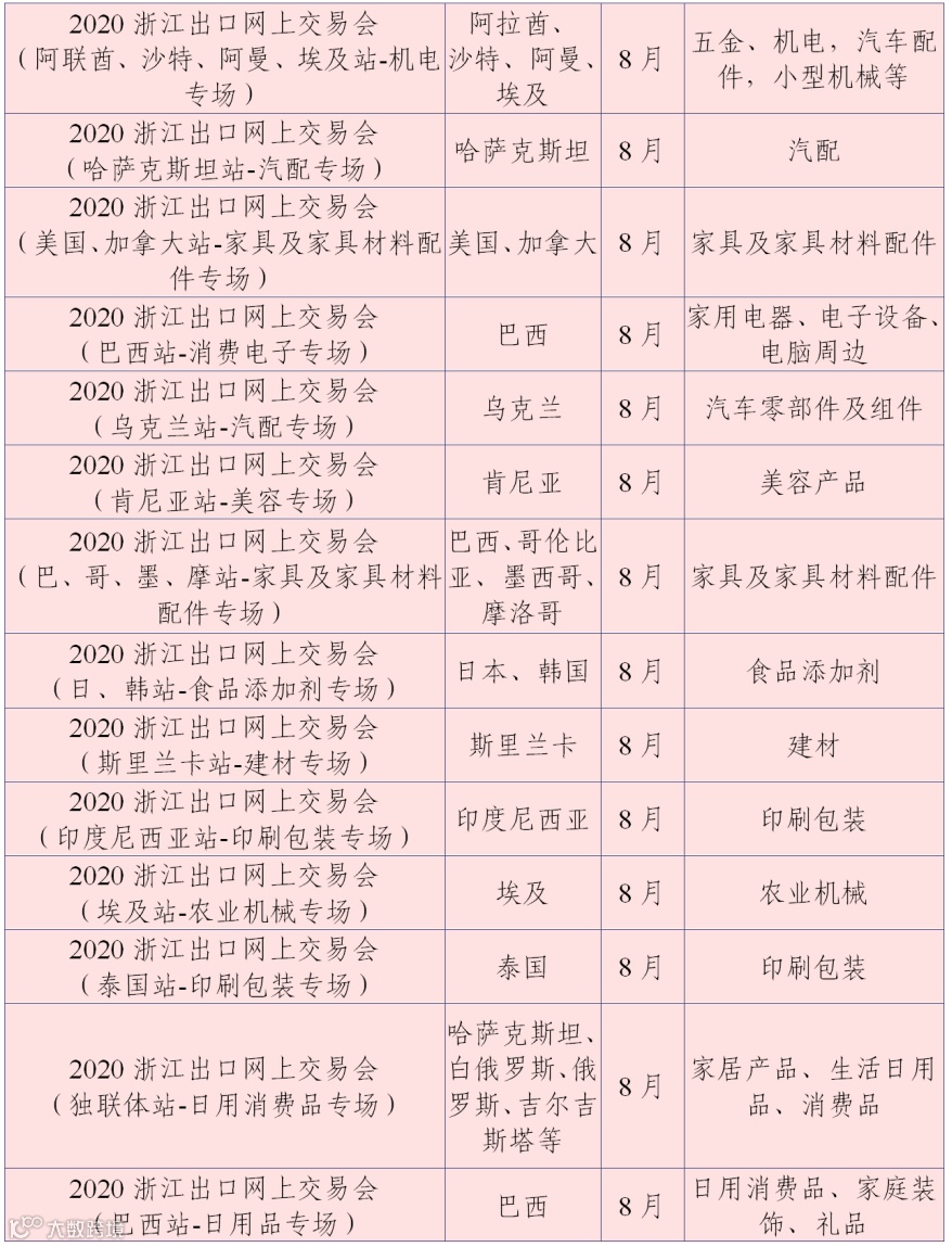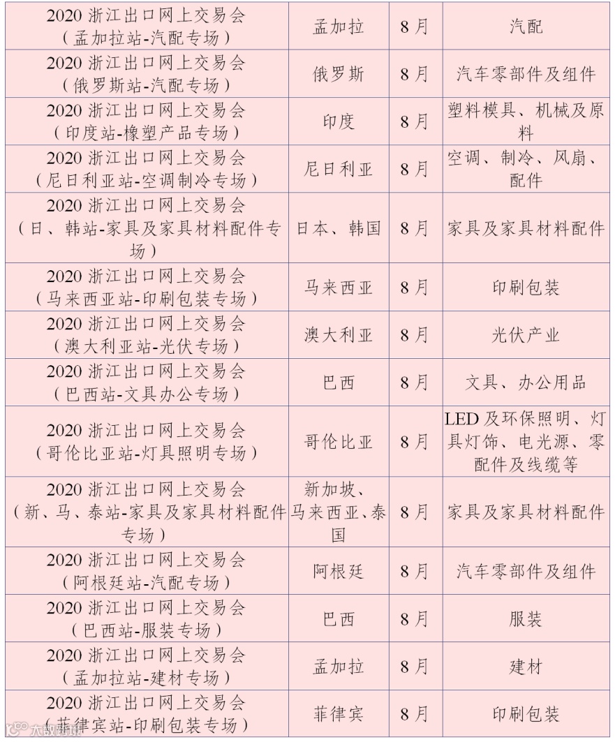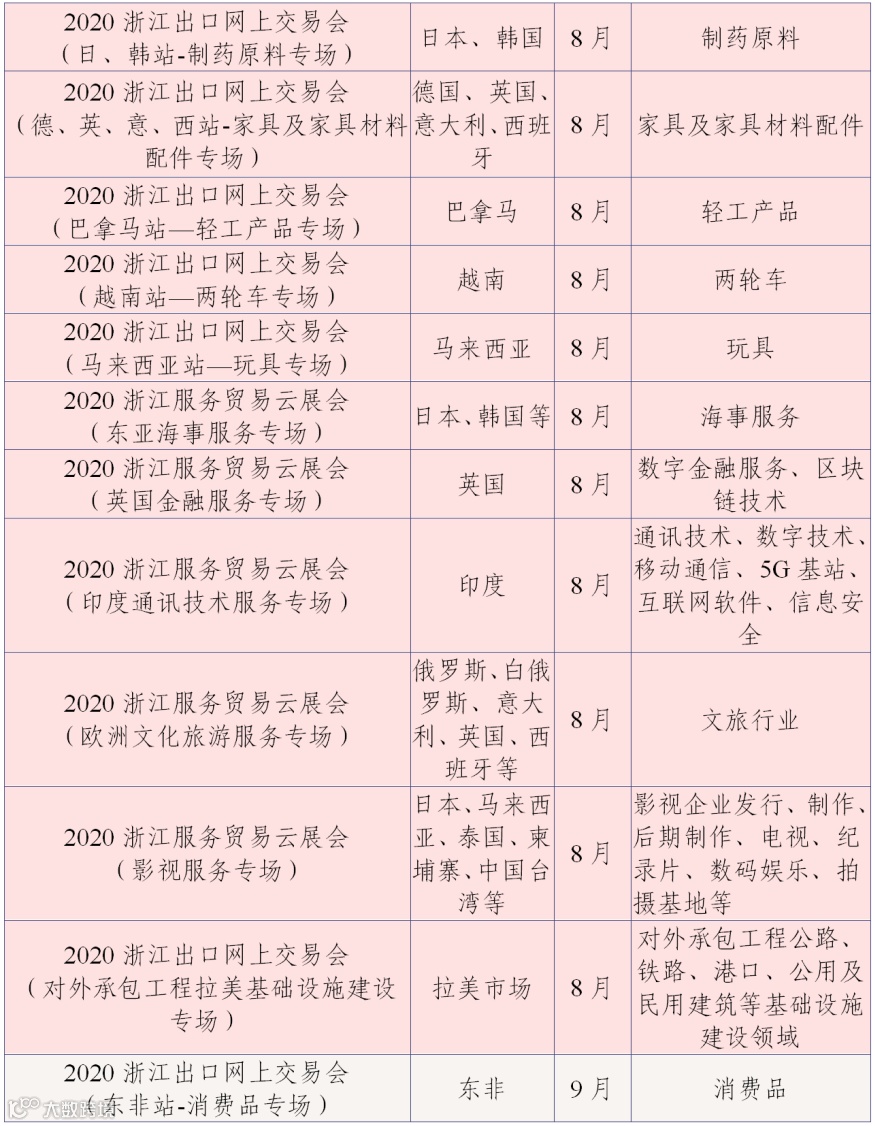 为丰富网上交易会内容,7-9月的网上交易会将根据展会的特点开展“云论坛”“云展示”“云洽谈”“云签约”等形式多样的活动,为浙江企业与境外采购商搭建更多样的合作和交流平台。现将网上交易会目录(第三批)予以公布: